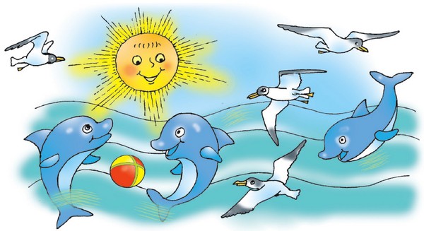 Сонце. Ви чуєте цей тихий шурхіт, ледь помітний шепіт? Це — дихання сонного моря. Вже розплющило очі я, Сонце. Зараз піднімуся в небо, залоскочу промінцями хвилі — і море прокинеться, усміхнеться синіми-синіми очима, зашумить радісно. Затанцюють на ньому білі баранці, а над ними заметушаться галасливі чайки… Застрибають, виблискуючи боками, дельфіни. А в глибині така краса! Різнобарвні риби, медузи, краби, восьминоги, дельфіни… Там, під водою, — цілий казковий світ, яскравий і різнобарвний, адже на морському дні є і перлини, й корали, і морські зірки. (Йде).