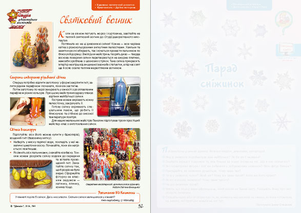 Майстри відкривають малятам і дорослим секрети виготовлення нестандартних свічок. Їх можна використати і як оригінальну прикрасу кімнати, і як подарунок до свята, і як засіб створення особливої таємничої атмосфери, родинного затишку… Виготовити свічку можна і на заняттях з художньо‑естетичного розвитку, образотворчої діяльності, і під час проектної діяльності щодо ознайомлення дошкільників та учнів початкових класів з декоративним мистецтвом. Така діяльність допоможе розвинути їхню креативність, дрібну моторику.