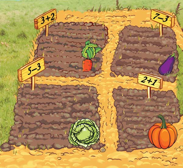 ► Розв’яжіть приклади на дощечках і наклейте на грядки відповідну кількість овочів.