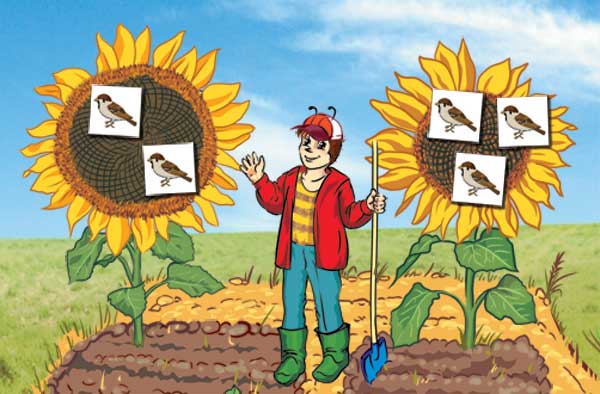 - Чи однакові соняшники? На якому соняшникові більше (менше) горобців?