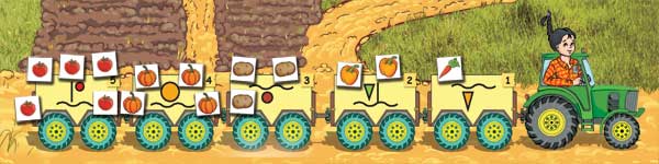 ► Завантажте врожай на причепи, які везе тракторець Нотки. Розшифруйте піктограми і наклейте відповідні овочі. Кількість плодів на причепі має відповідати його номеру.