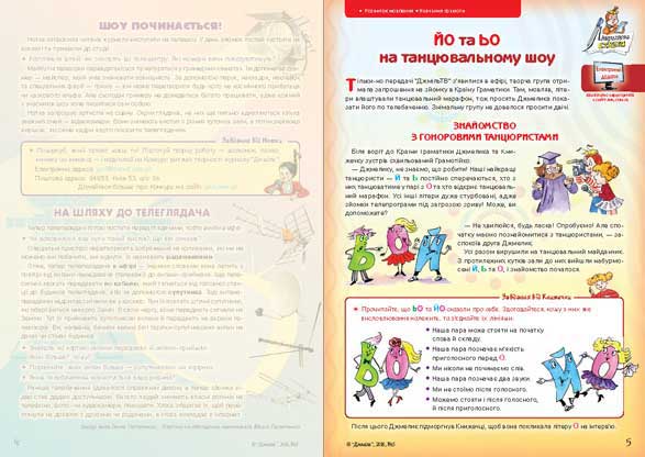 На читачів друкованої версії журналу “Джміль” чекає інтерв’ю з літерою О, в якому вона розповіла, чому не варто запізнюватися. А ще вони потраплять на танцювальний турнір у Країні Граматики, де малята зможуть розв’язати веселі завдання і вивчити правила вживання буквосполучень ЬО та ЙО.