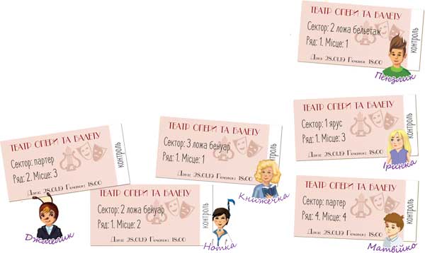 У ваших руках квитки на виставу. Час зайняти місця у глядацькій залі. Але тут сотні крісел, а буває, що й на різних поверхах! І як дати собі з цим раду? Допоможе заняття у нашому Клубі кмітливих.